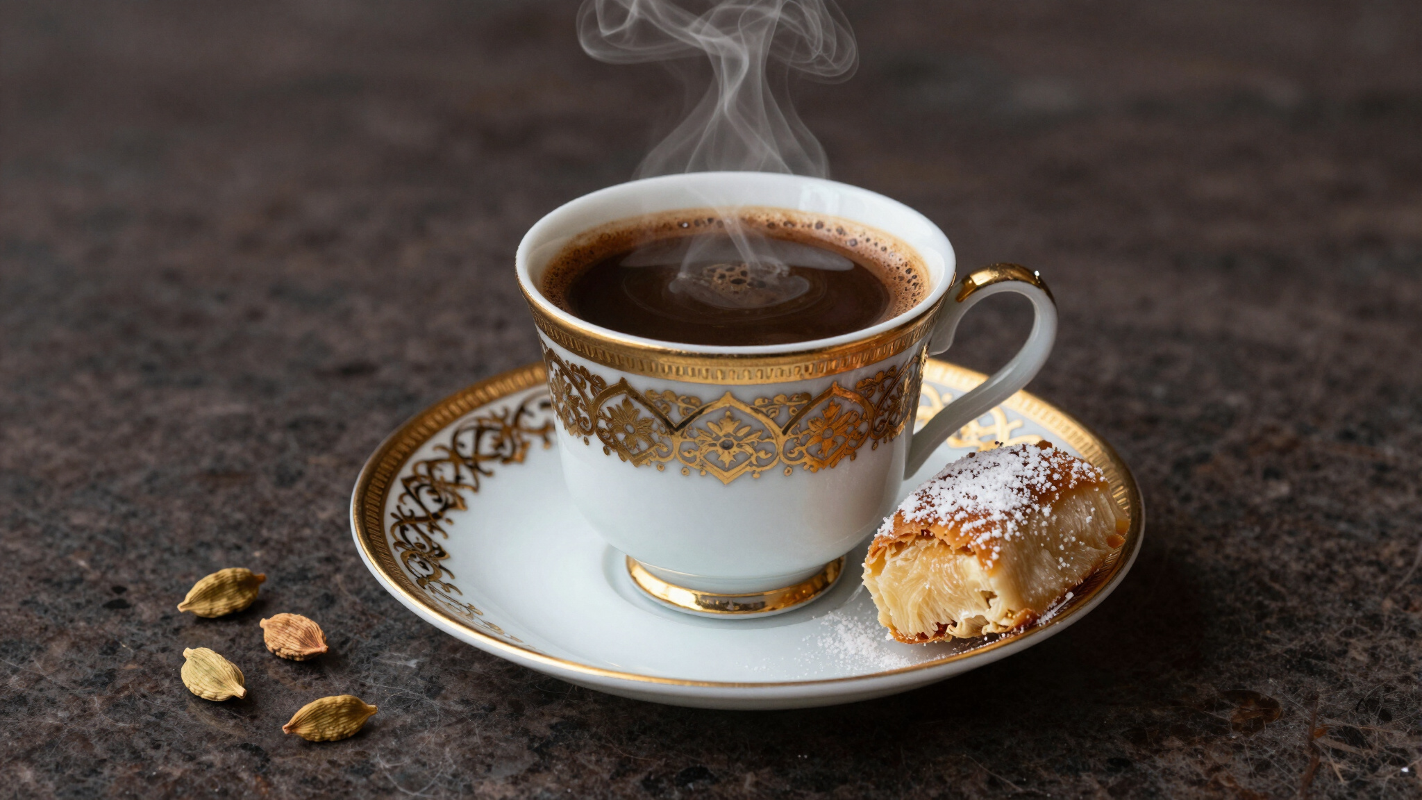 Finely roasted beans blended with freshly ground green cardamom pods, creating a rich texture and an unmistakably authentic aroma that honors centuries of heritage.